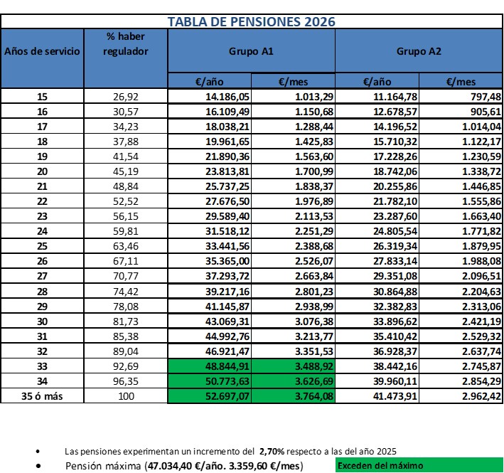 Los funcionarios del grupo A1 con 33 o más años de servicio superan el límite máximo de las Pensiones Públicas, por lo que cobran este límite y no la pensión que les correspondería aplicando al haber regulador el porcentaje por tiempo de servicio.